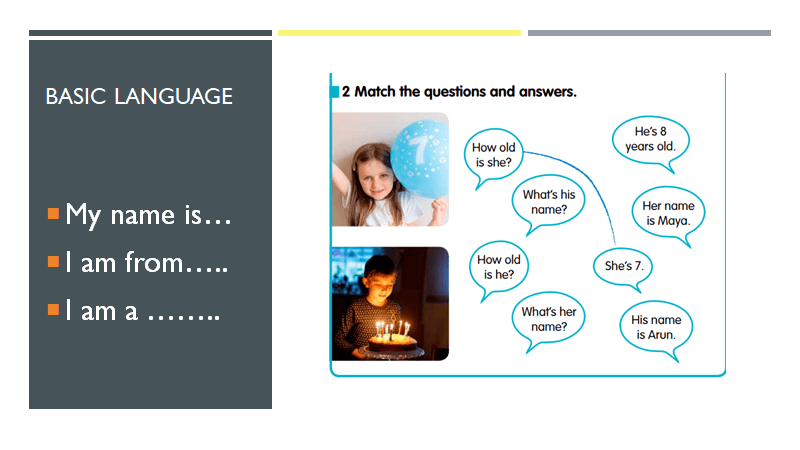 This is an example of a problem solving activity where we have to match the questions and the responses based on the pictures. However, as with many convergent thinking activities, although we have photos of Aaron and Maya, there is no engagement with them and there is no learner language generation. The questions and responses are provided and the task is to match them (a problem solving analytical thinking task but there is no actual language practice).