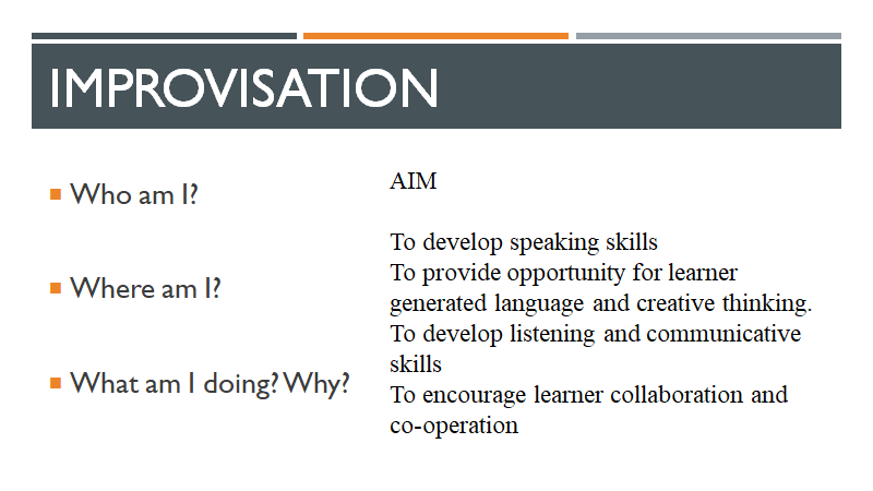 Now we have created a character and we have sent the character on holiday.  We have prepared enough material to conduct an improvisation role play. Role plays are very useful for developing speaking skills. In order to develop learners’ oral fluency, they need plenty of practise speaking in a free and improvised manner. If the role play is not set up effectively it can lead to frustration and chaos but when set up efficiently it provides a dynamic engaging, creative learning opportunity. In order to set up an improvised role play learners need to know: