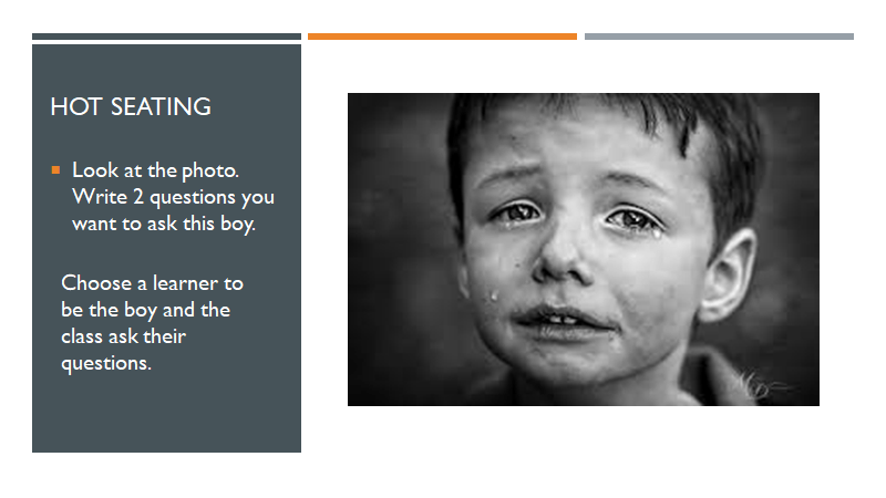 The next activity is called hot seating. In a drama class you have the learners sitting in a circle and you ask one learner to go into the middle of the circle and to adopt an attitude (for example – look sad) and then the other learners will be asked to write questions for that person. You can use a learner, or you can use a photograph. This is a photograph I have chosen of a young boy crying. After asking the learners to write four questions they would like to ask the little boy, in pairs or groups you get them to compare the questions and choose which ones they think they would like to ask. You will notice that some of the questions will be lower order thinking: ‘Is he crying?’ Some of them will be higher order critical thinking: ‘Why is he crying?’