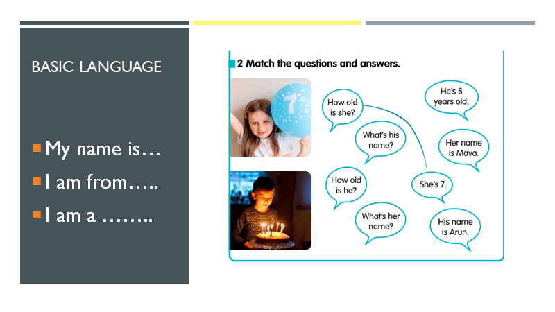Teachers sometimes say to me, ‘I can’t use drama because my learners are a very low level and they cannot generate their own language or their own ideas’. This first activity is for low level learners with very basic language. For example: ‘my name is,’ ‘I am from …,’ ‘I am a teacher’. Typically in a course book names, nationalities and jobs may be introduced through a context where we have some photographs and a matching activity.