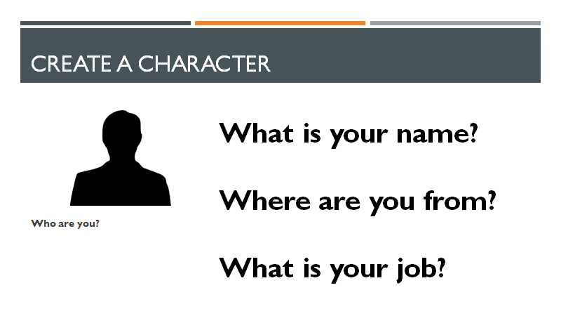 Now we have created a character and we have sent the character on holiday.  We have prepared enough material to conduct an improvisation role play. Role plays are very useful for developing speaking skills. In order to develop learners’ oral fluency, they need plenty of practise speaking in a free and improvised manner. If the role play is not set up effectively it can lead to frustration and chaos but when set up efficiently it provides a dynamic engaging, creative learning opportunity. In order to set up an improvised role play learners need to know: